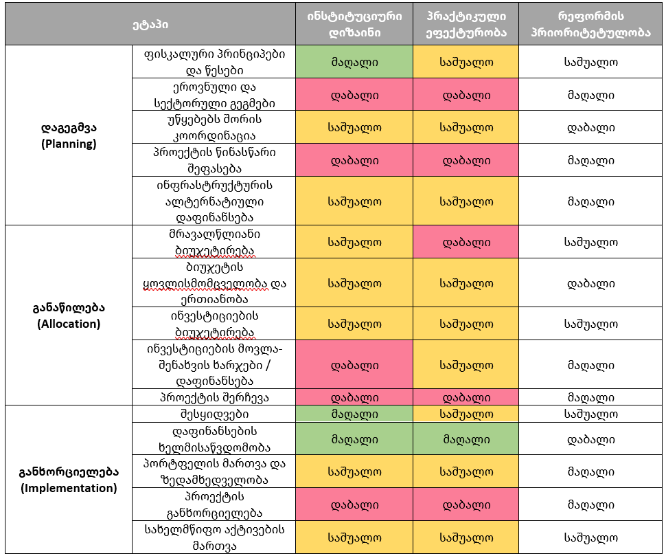 - საქართველო, ძირითადად, საშუალო მაჩვენებლით შეფასდა PIMA-ს მოცემული 15 კატეგორიის მიხედვით (ცხრილი 1). დაბალი შეფასებები აღსანიშნავია, როგორც პროექტის წინასწარი შეფასებების, ასევე პროექტების შერჩევისა და განხორციელების ეტაპებზე; დაბალი შეფასებებია ასევე ეროვნული და სექტორული გეგმების კატეგორიაში. მაღალი შეფასება დაფიქსირდა დაფინანსების ხელმისაწვდომობაში; მაღალი შეფასებები დაფიქსირდა ასევე ფისკალური პრინციპებისა და წესების და შესყიდვების კატეგორიაში, თუმცა, მხოლოდ ინსტიტუციური სიძლიერის („on paper“) და არა პრაქტიკული ეფექტურობის („in practice“) თვალსაზრისით.