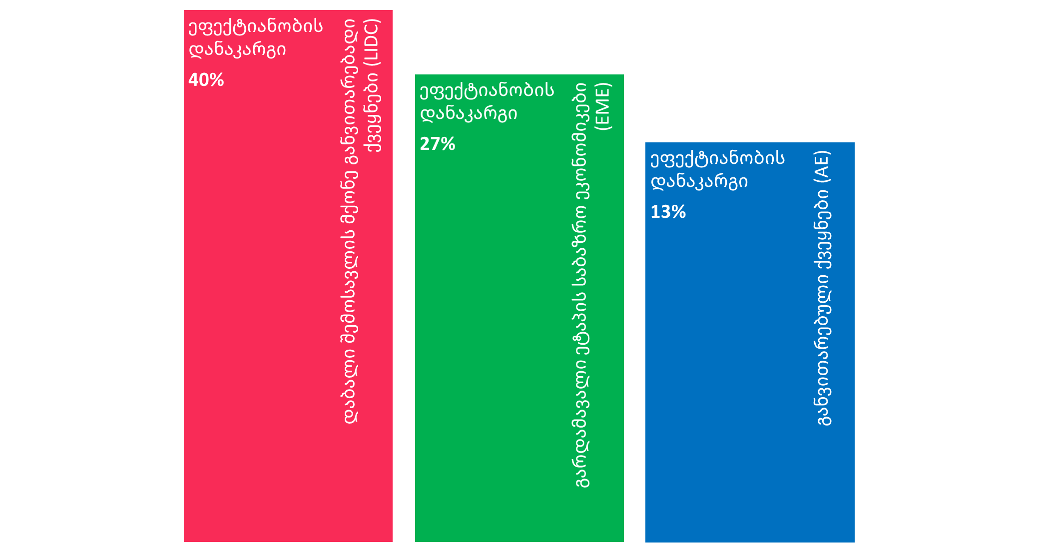 PIMA შეფასებებმა სხვადასხვა ქვეყნებში აჩვენა, რომ ქვეყნები ინვესტიციებიდან უკუგების დაახლოებით 30%-ს კარგავენ სწორედ სახელმწიფო ინვესტიციების მართვის პროცესში არსებული არაეფექტიანობის გამო[iii]. ეს დანაკარგები მნიშვნელოვნად დამოკიდებულია ქვეყნის განვითარების დონეზე. მაგალითად, დაბალი შემოსავლის მქონე განვითარებად ქვეყნებში (LIDC) აღნიშნული დანაკარგი 40%-ია, გარდამავალი ეტაპის საბაზრო ეკონომიკებში (EME) - 27%, ხოლო წამყვან განვითარებულ ქვეყნებში (AE) - მხოლოდ 13% (დიაგრამა 1).